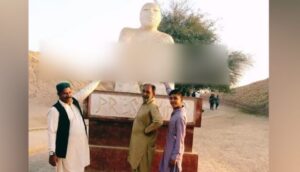 Three persons photographed while humiliating the statue fixed ath Mohenjo Daro site in district Larkana.
